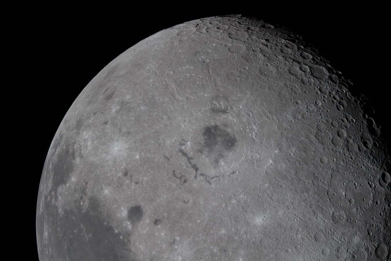 As they passed behind the moon, the astronauts were treated to a view of areas that had never before been seen by human eyes, such as the entirety of a crater called Orientale basin (below). The dark patch at the centre of the crater is dried lava from an eruption billions of years ago. The astronauts proposed new names for two smaller craters near Orientale: Integrity, after their spacecraft, and Carroll, after Wiseman’s late wife.